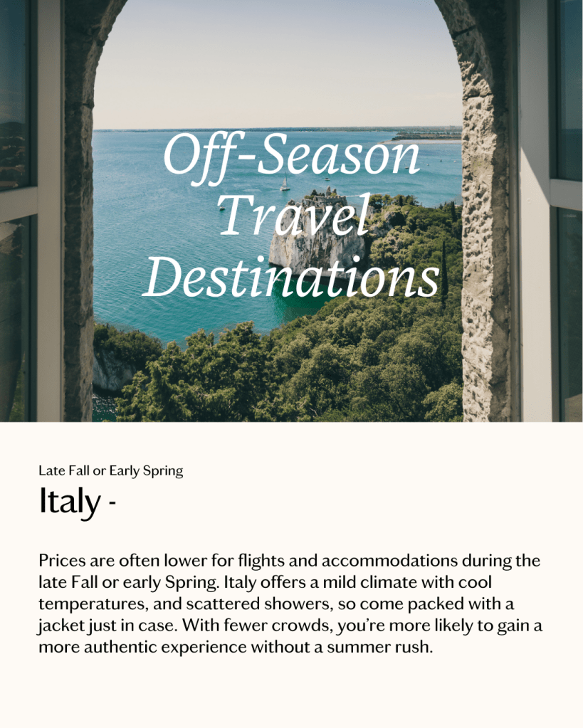 There are many perks to visiting a destination outside the typical tourist season. First, there are fewer crowds, which allows employees to provide better service. Secondly, you’re likely to see lower costs on accommodations and attractions.