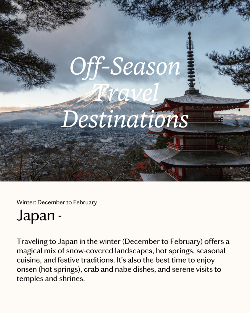 Tokyo: Mild winter with illuminations, seasonal foods, and events like New Year’s celebrations.