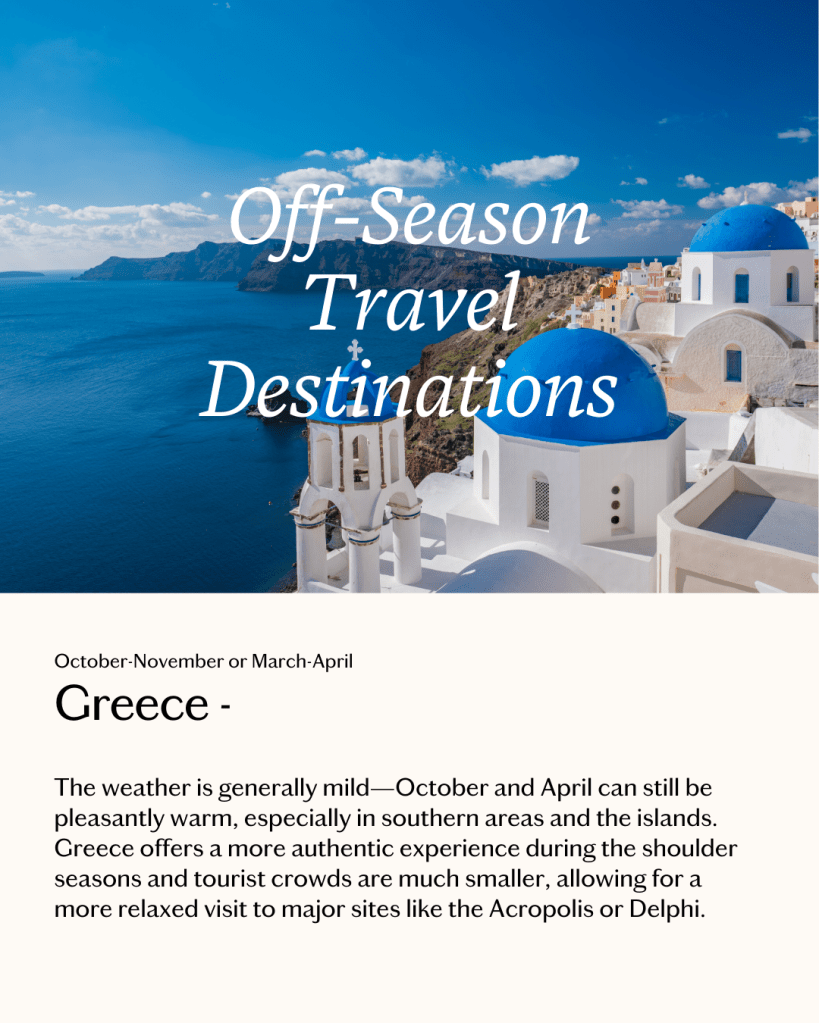 Athens: Mild weather and fewer tourists on the ferry—perfect for the Acropolis, museums, and historic neighborhoods like Plaka.
