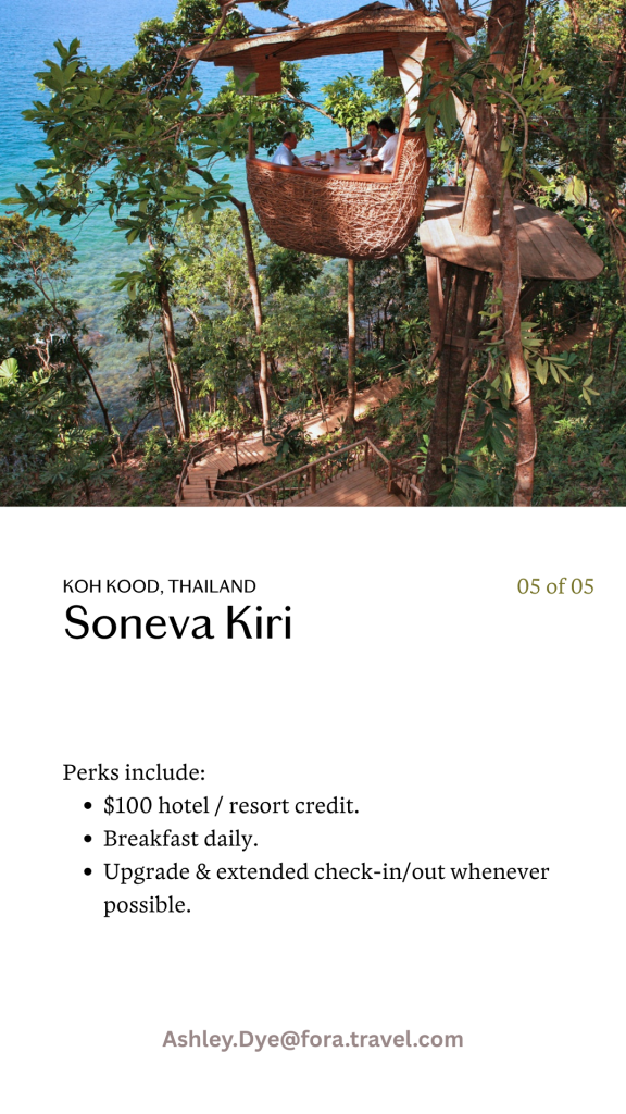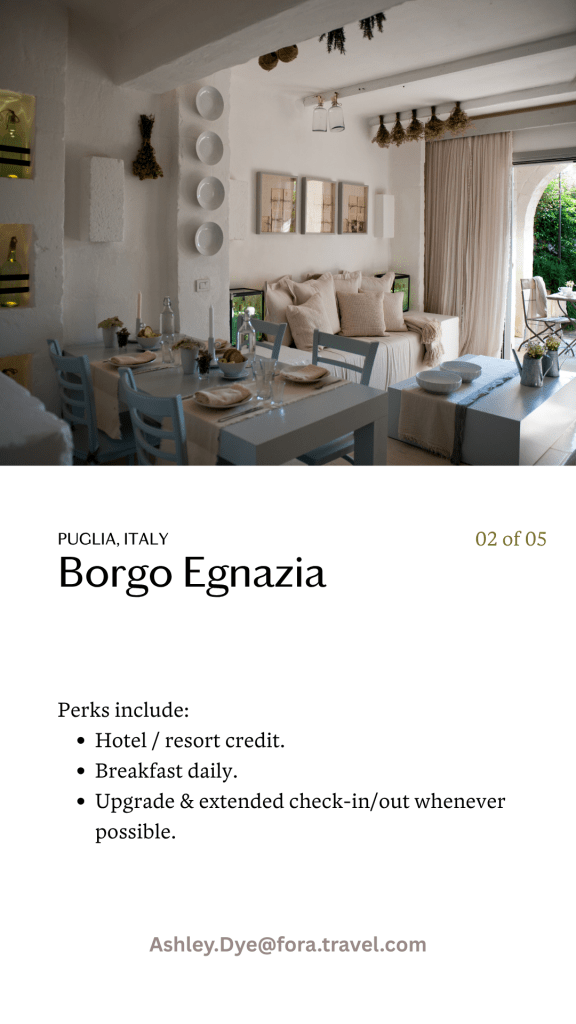 Let me guide you on your next adventure! Thanks to our global partnerships at Fora, you’ll get access to perks you won’t find online: complimentary spa treatments, romantic dinners, room upgrades, and more.