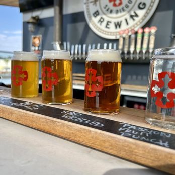 This brewery offers 16 taps, brewery tours (Fr–Sun at 2, 4 & 6 pm), shuffleboard, cornhole, and a bottling‑line mezzanine bar. The headquarters is located downtown @ 131 14th St, San Diego, CA 92101, and is pet-friendly.