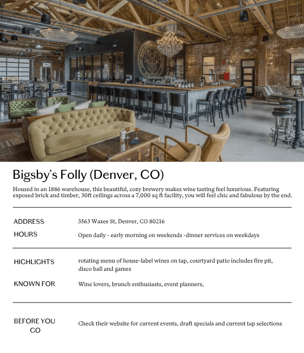 Bigsby’s Folly is a charming urban winery and restaurant with a laid-back atmosphere and a spacious patio. Currently offering 12 wines on tap, including in-house labels and rotating regional selections.