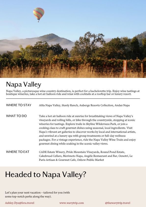 Napa Valley, California, is the perfect blend of elegance and fun. This beautiful region is known for its hillside vineyards and gourmet dining and offers a relaxing yet sophisticated escape. Whether you’re sipping bubbly on a wine tour, indulging in gourmet meals, or unwinding with a group spa day, Napa sets the scene for a truly unforgettable celebration with your favorite people.