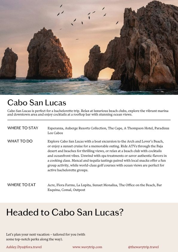 Cabo San Lucas is a sun-soaked paradise that’s perfect for a bachelorette trip filled with beach vibes and unforgettable memories. From lounging at luxury resorts and sipping margaritas poolside to sunset cruises, spa days, and dancing the night away at oceanfront clubs, Cabo blends relaxation and celebration effortlessly.