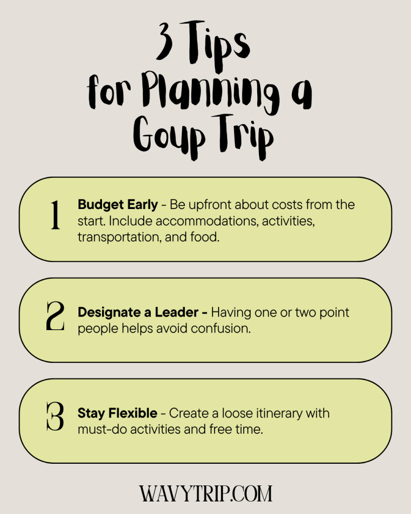 Most hotels offer group rates if booking more than 8 or so rooms, so be sure to get an early headcount. Choose a loose itinerary with must-do activities and built-in breaks. This ensures everyone can enjoy their experience without feeling overwhelmed or rushed.