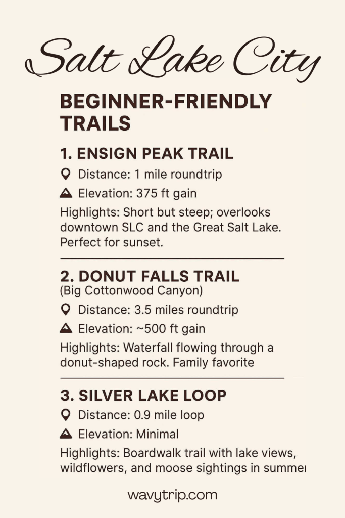Ensign Peak Trail: Beginner, 1 mile round-trip, 375ft elevation, perfect for sunset